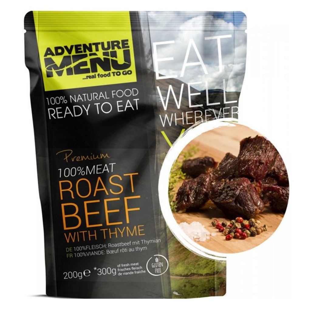 Adventure Menu Roastbeef with Thyme är en naturlig och smakrik måltid med 98% rostbiff, kryddad med timjan, salt och peppar. Handlagad, fri från tillsatser och GMO, med 3 års hållbarhet – perfekt för friluftsliv och äventyr.