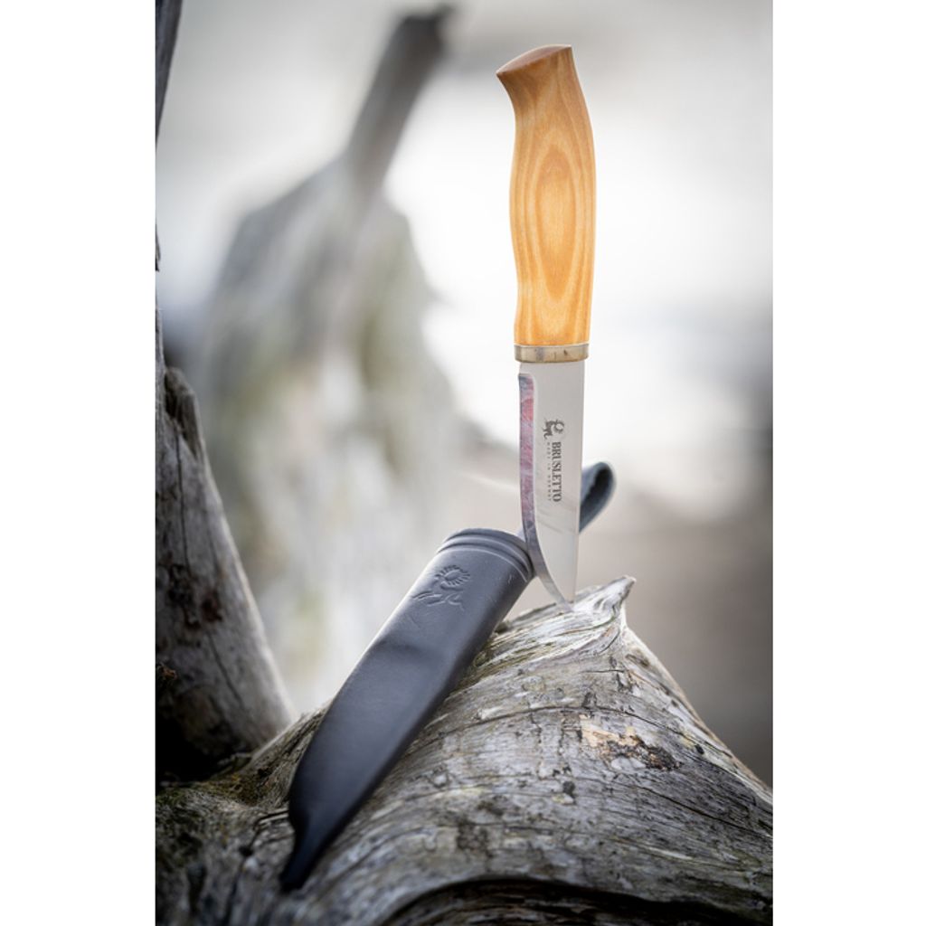 Brusletto Bruslettokniven är en allroundkniv för jägare och friluftsfolk, med rakslipat, hållbart 14116N stålblad och oljat björkskaft, perfekt för mångsidig användning i naturen.