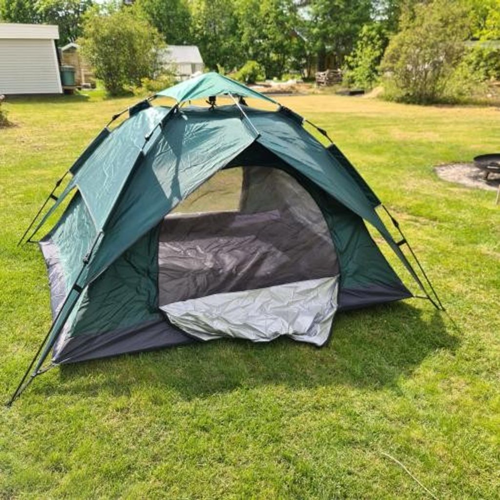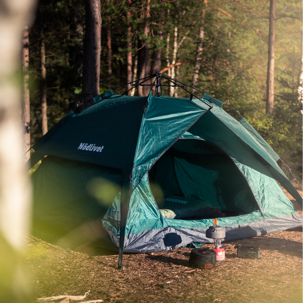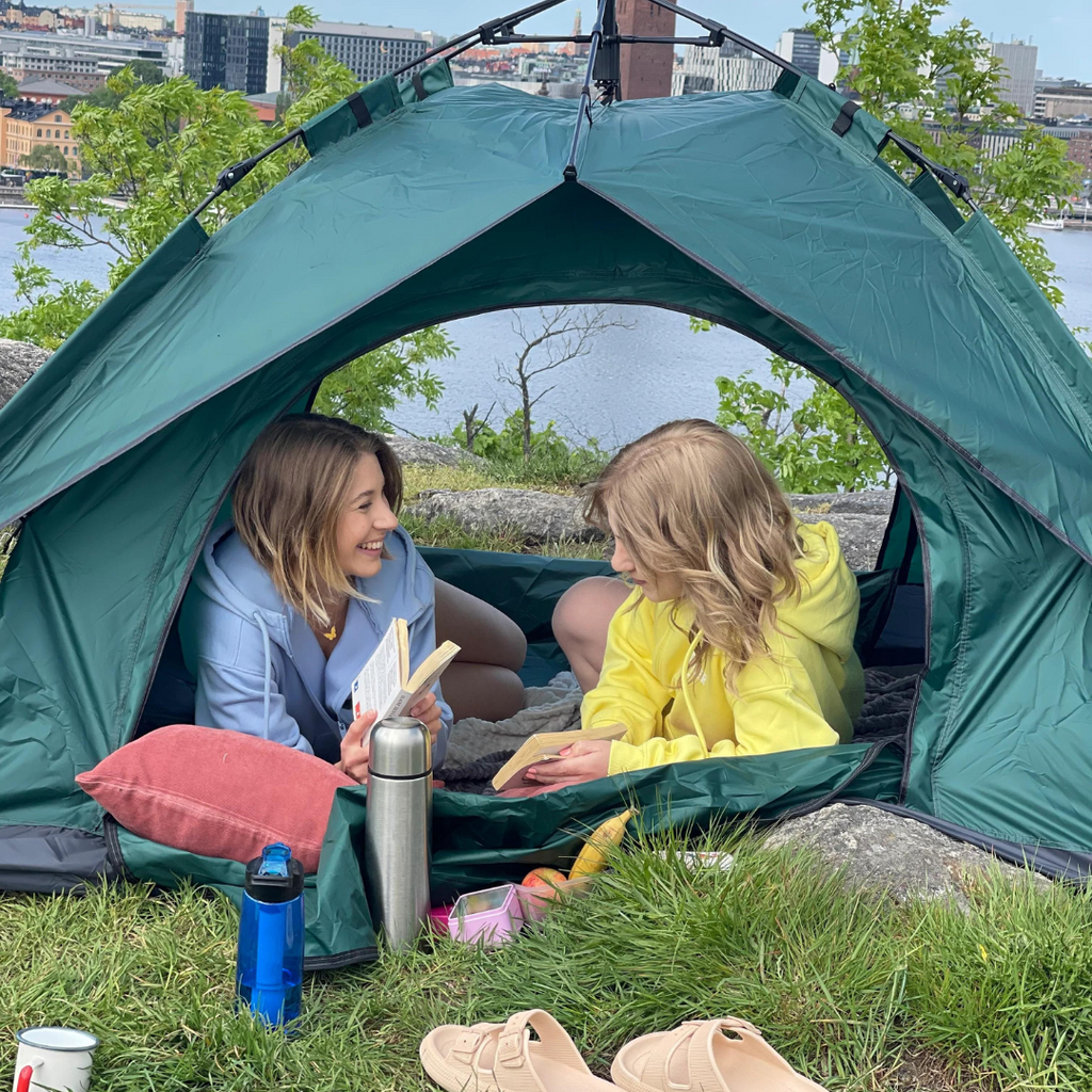 Pop-up tält med snabb montering på sekunder utan krångel med tältpinnar. Robust konstruktion med myggnät, glasfiberstänger och hög vattenpelare för skydd mot väder och vind – perfekt för smidig och bekväm camping!