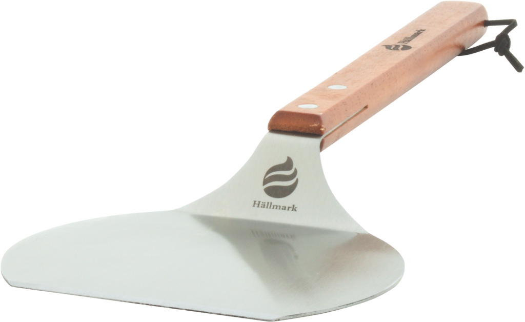 Extra bred och smidig spatel i rostfritt stål med träskaft, perfekt för användning med Hällmarks hällar. Längd: 46 cm.