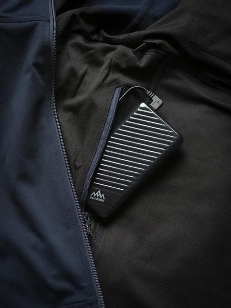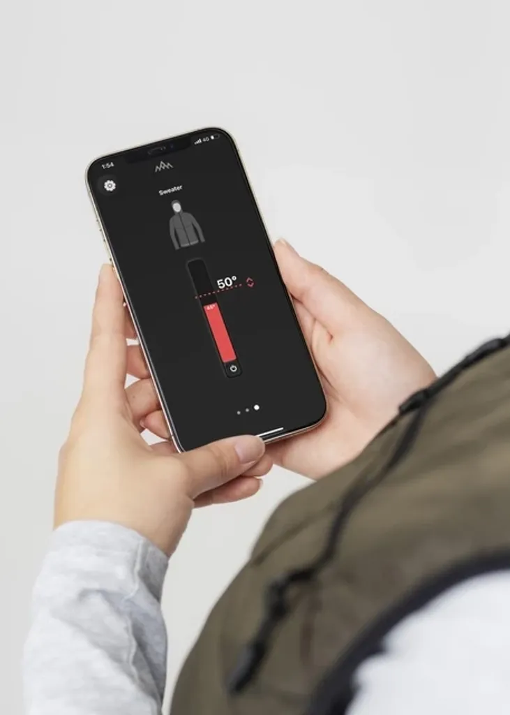 De inbyggda värmepanelerna kan styras via Heat Experience-appen för att ge stabil kärntemperatur oavsett väder – från fjällvandring till vardagliga ärenden.