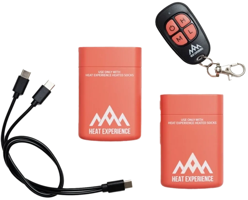 Reservbatteri och fjärrkontroll som ger enkel laddning och smidig värmereglering till HeatX Heated Everyday Socks V2.