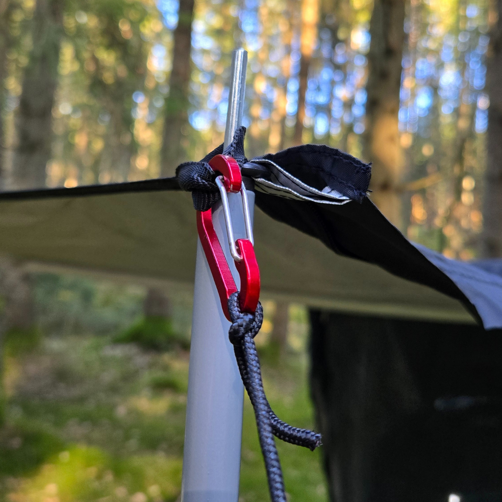 Våra högkvalitativa röda karbinhakar ger dig ett pålitligt sätt att fästa och organisera din utrustning under vandringar och campingresor.