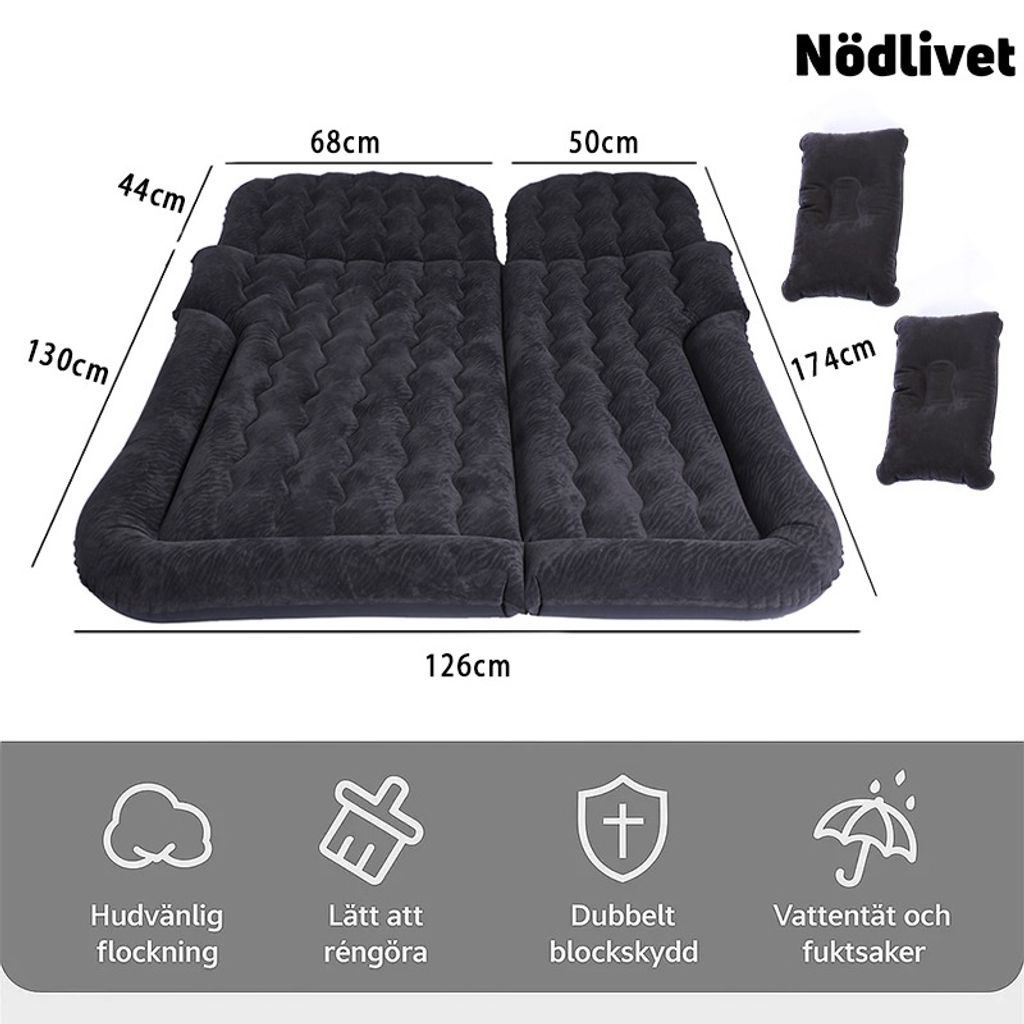 Den här uppblåsbara bil-madrassen förvandlar baksätet till en mjuk, skön säng - perfekt för dig som sover i bilen under roadtrips, camping eller när du använder vårt biltält.