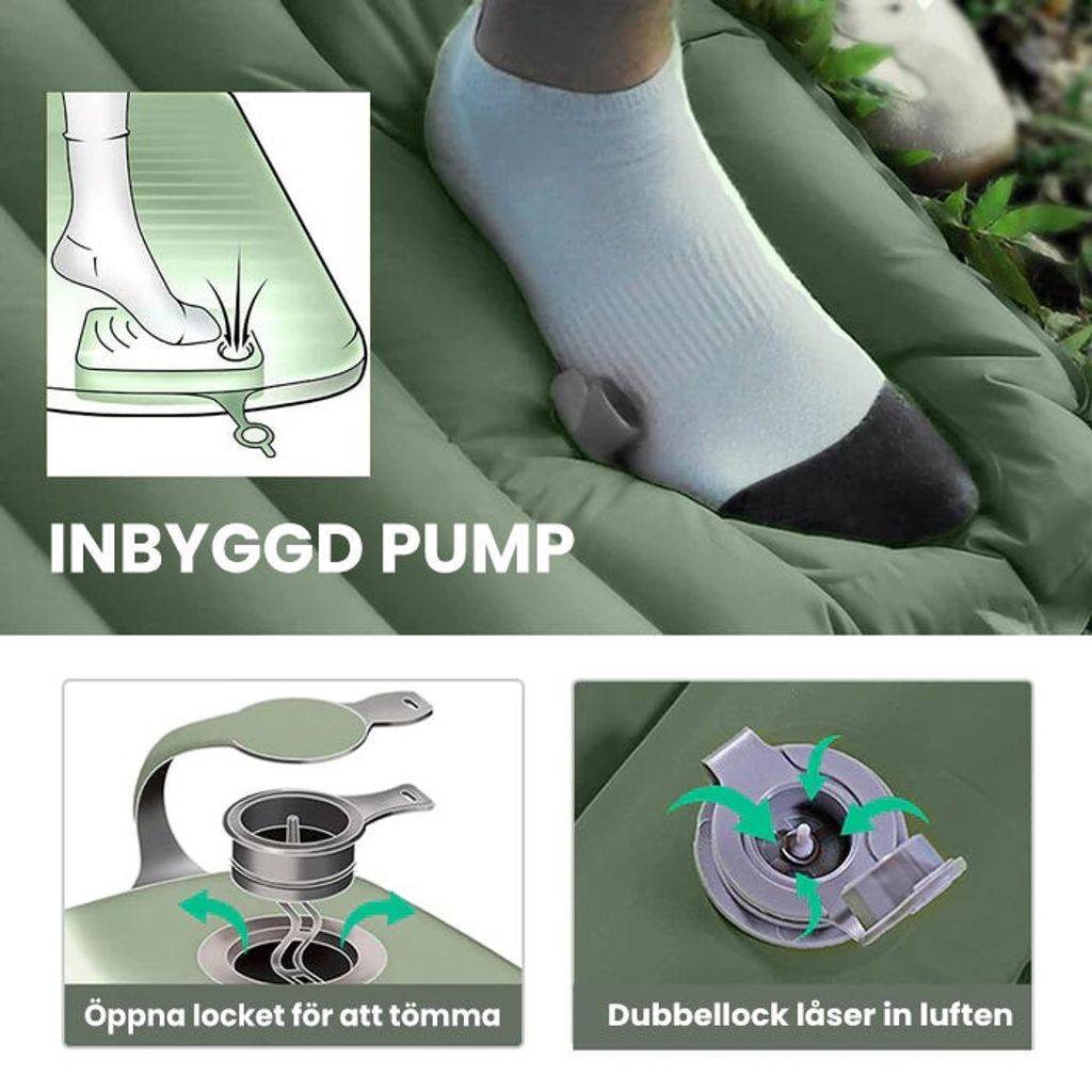 Den inbyggda pumpen gör det enkelt att blåsa upp liggunderlaget på bara någon minut. Efter en lång dag vill du slappna av snabbt. Pumpa enkelt upp madrassen med foten eller händerna och njut av din resa.