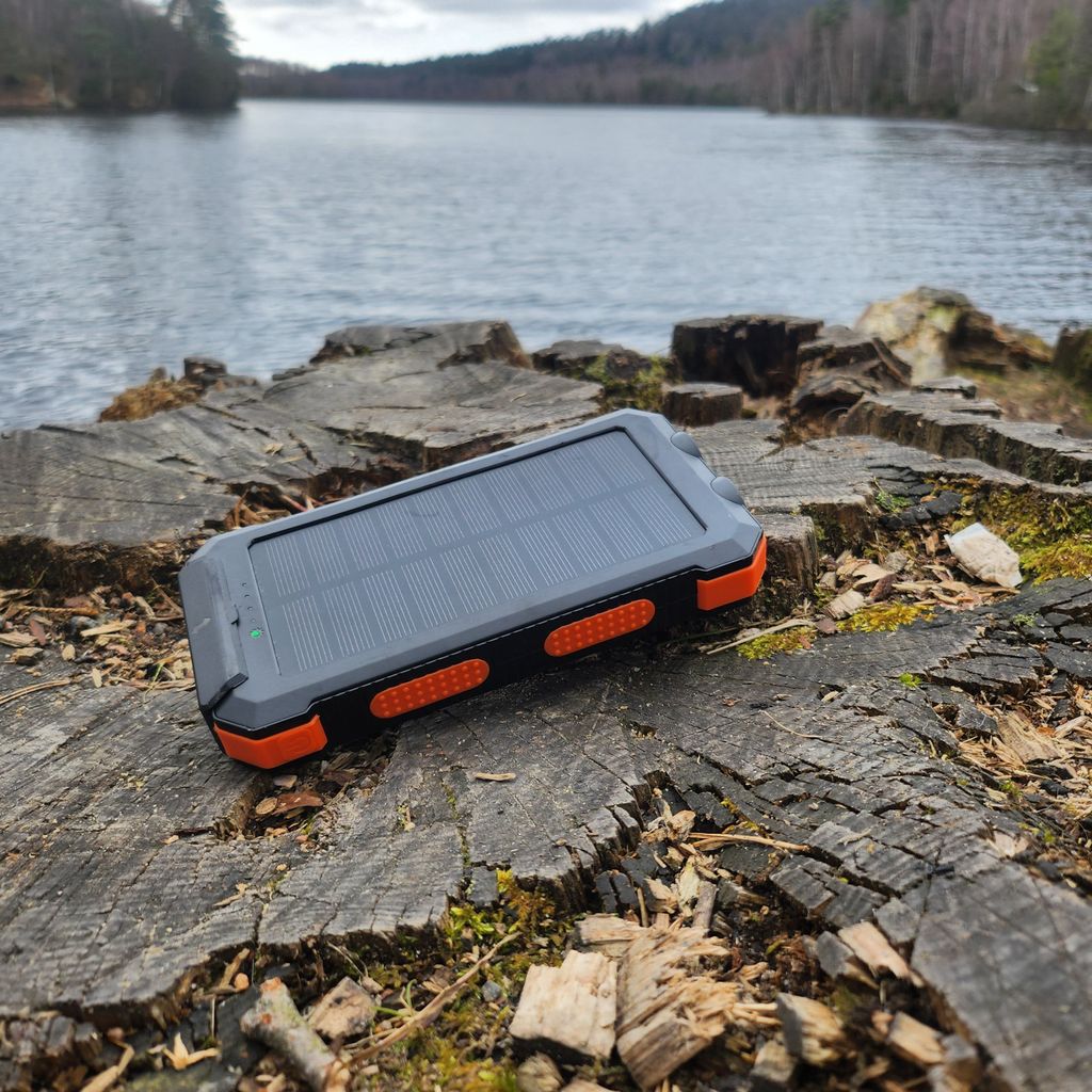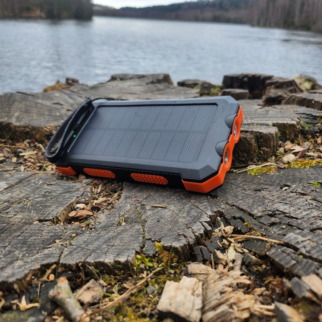 Powerbank med solceller och 20 000 mAh kapacitet – perfekt för utomhusbruk. Vattentålig, bärbar och utrustad med USB-uttag för flexibel laddning.