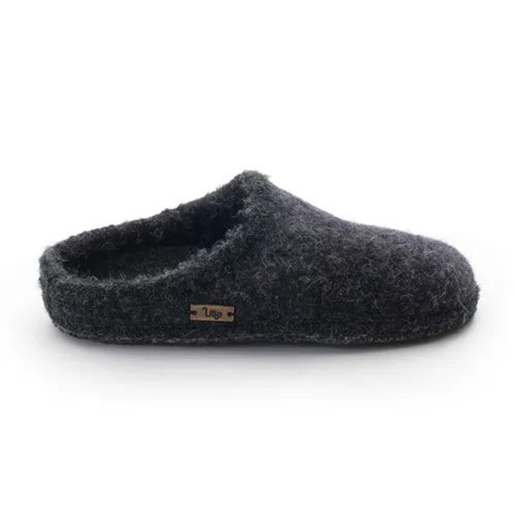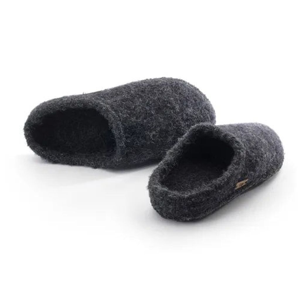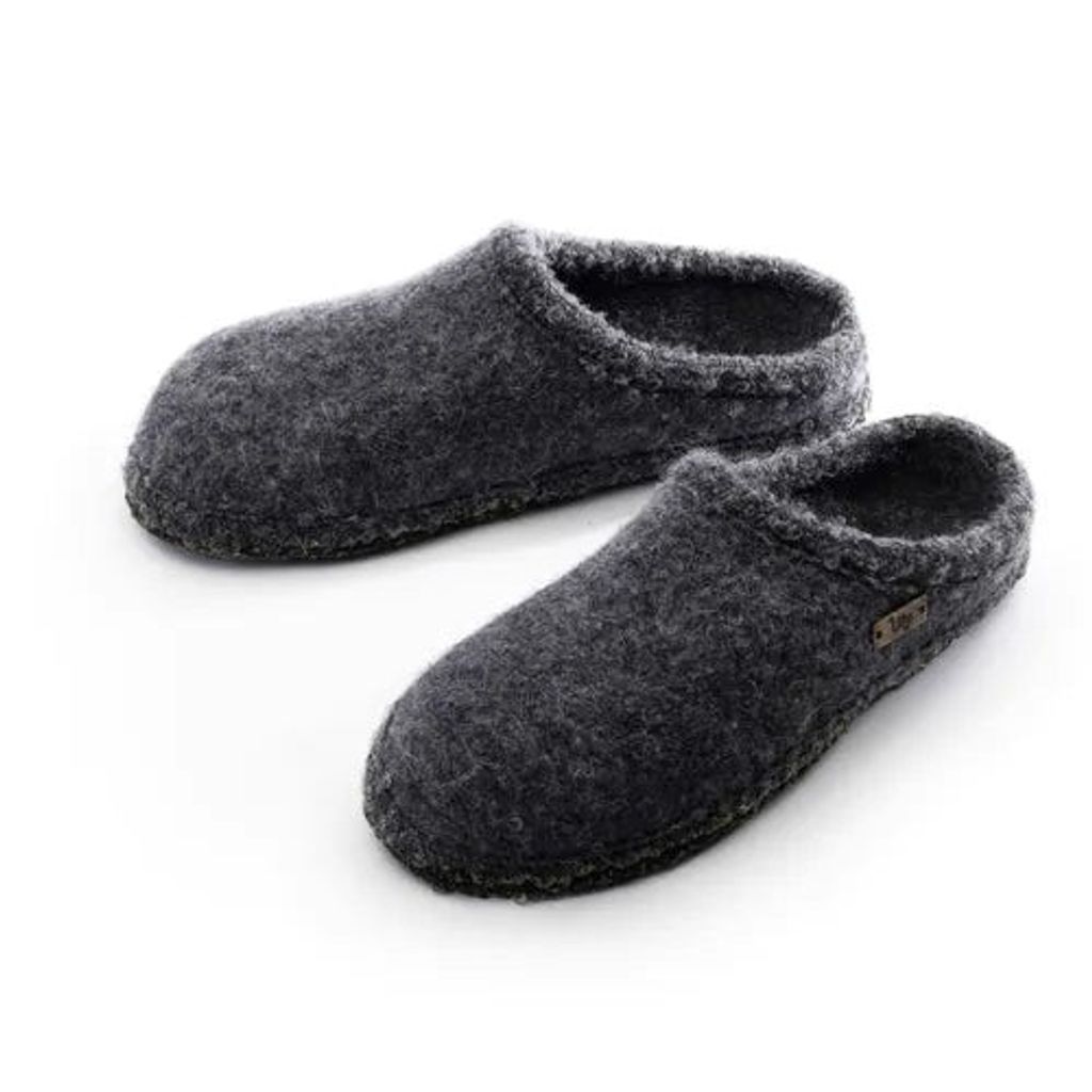 Exklusiva ulltofflor i 100% mohairull (unisex, Dark Grey) i tidlös design, varmare och slitstarkare än fårull, formar sig skönt efter foten med ortopedisk sula för stöd.