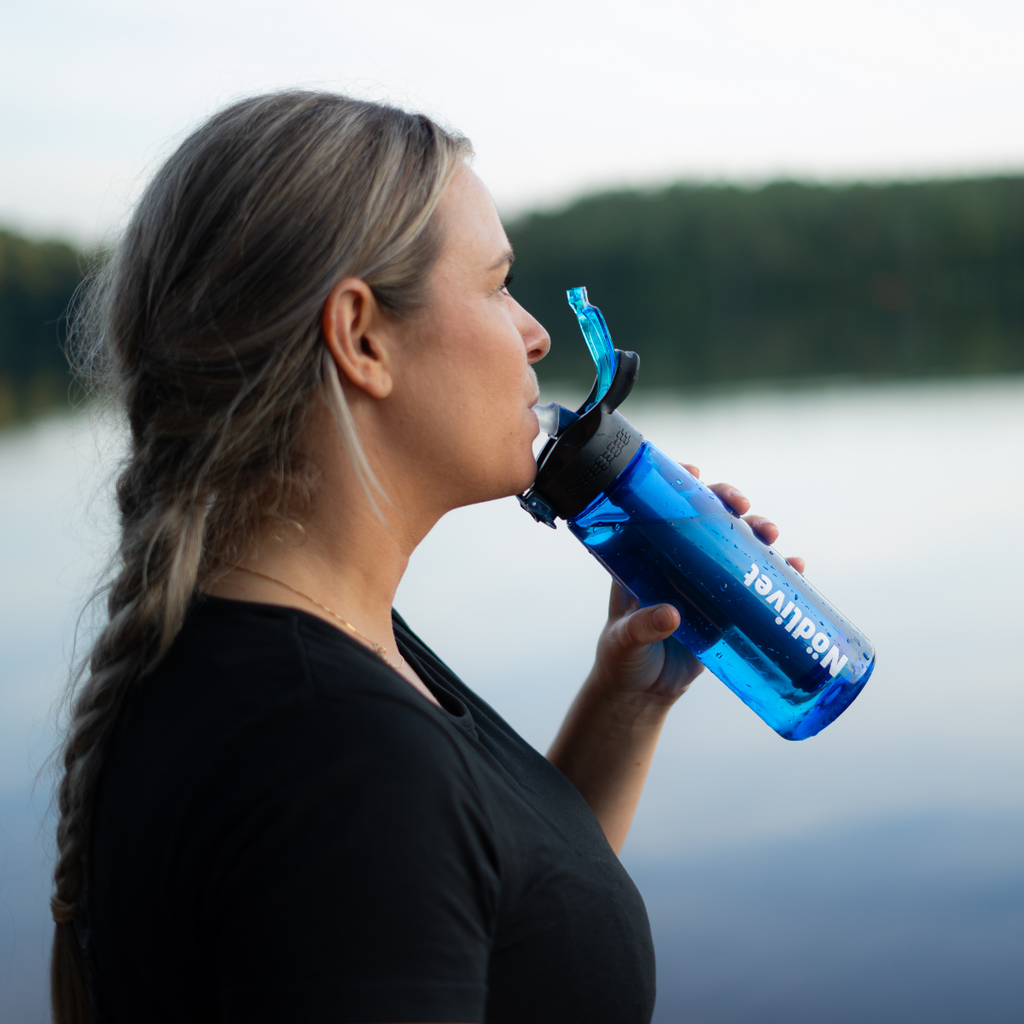 Vår vattenflaska med reningsfilter ger 99,9% rening och hanterar upp till 1500 liter vatten per filter, perfekt för resor, camping och vardagsbruk. Kompakt, lätt och hållbar – din pålitliga följeslagare för rent vatten var du än är.